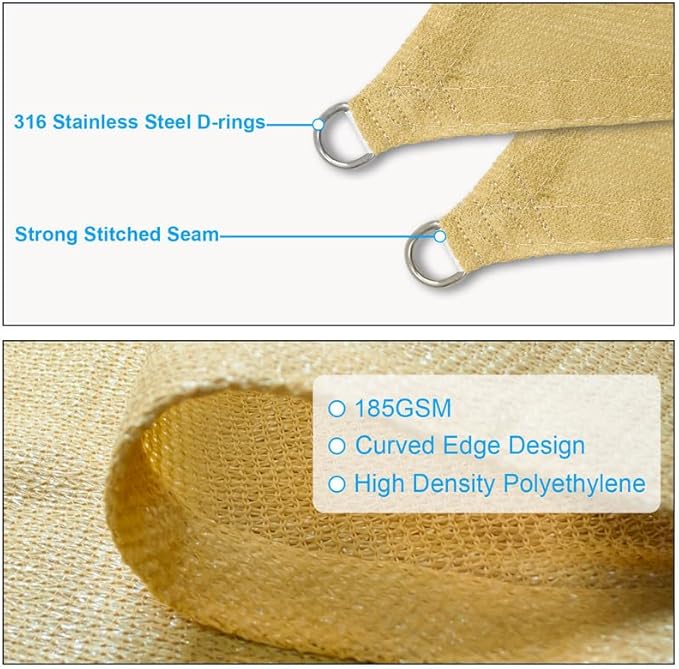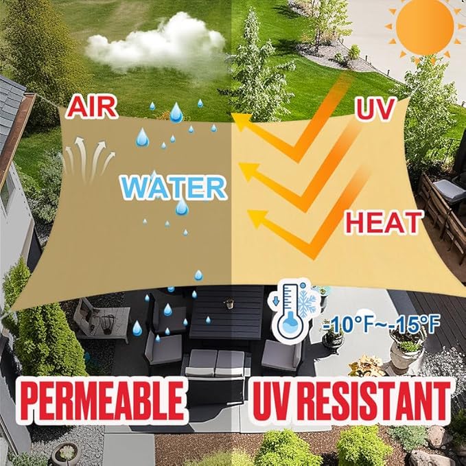 - Premium UV Protection – 185GSM HDPE Fabric: Blocks 95%–98% of harmful UV rays while allowing air to flow freely, keeping your outdoor space cool and safe for relaxing, dining, or playing.