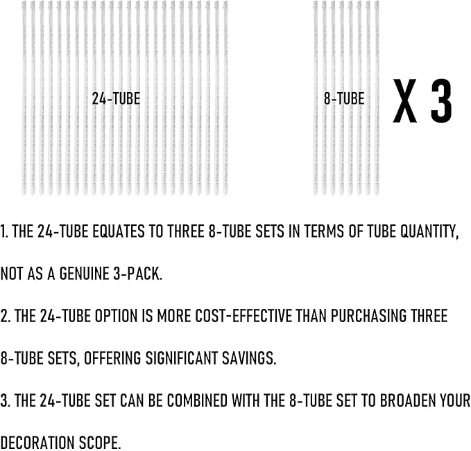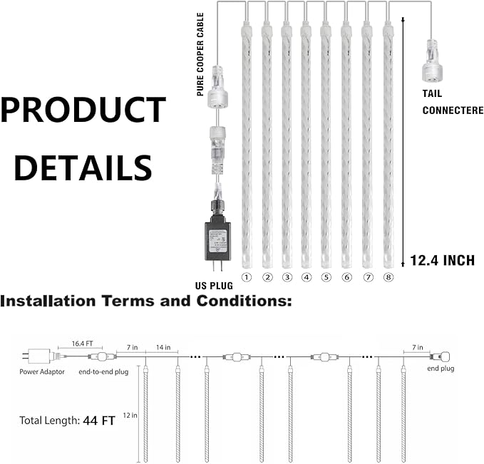 - Dimensions: The outdoor Christmas lights has 24 tubes, each tube size is 30 cm / 12 inches, the wire between tubes is 40 cm / 15.7 inch, each tube is individual of others, leading cord is 2.1 m / 6.9 ft. Each tube has 36 LED lights, is more bright than other 24 LED meteor shower lights.