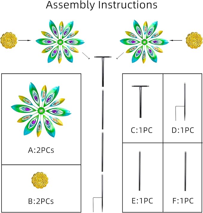 - 【Easy Assembly】Just need to tighten all parts of the wind spinner. And then insert the metal windmill garden stake into soil in an outdoor garden or backyard to enjoy your garden ornament. Besides, you can adjust the height of the garden wind spinner through the number of assembly rods as you want.