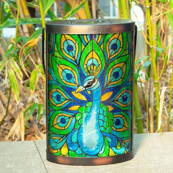 - Hanging solar outdoor lantern feature a vivid colorful peacock pattern, and this adorable glass solar lantern is very suitable for outdoor garden tabletop patio yard decoration
