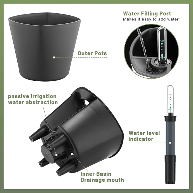 - Many self-watering pots do not have any drainage system, which can quickly lead to root rot. GS Garden's pot set has a unique support design that separates the plant's roots from the water storage layer, and promotes root growth and development through the micro-pores at the bottom of the inner, thereby creating root oxygen circulation.