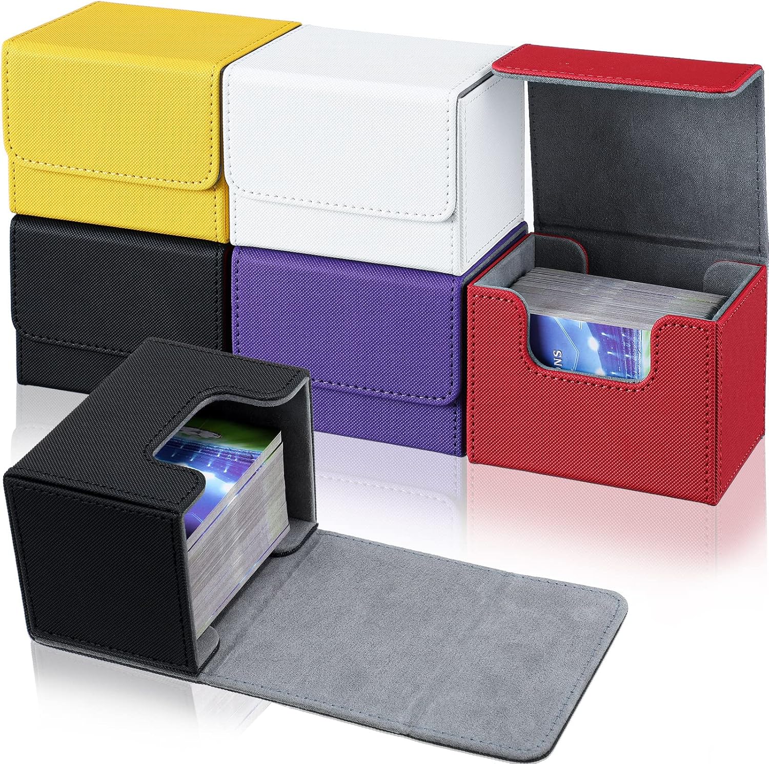 Yookeer 6 Pack Leather Deck Cases 100+ Card Deck Game Box Magnetic Playing Card Storage Box for 100 Plus Cards Compatible with Tcg(White,Black,Red,Yellow,Purple,Horizontal)