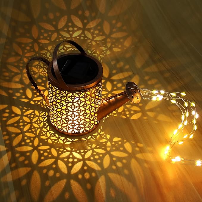 - Outdoor Solar Watering Can with Cascading Lights: This garden lights solar powered decor is a unique and nice decoration for the garden, which realistically mimics the effect of flowing water. Solar garden decorations look like little star shower lights at night. Yard decorations adopts premium punched iron sheet with hollow designation, increasing luminous beauty.