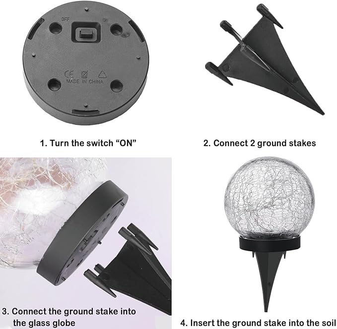 - CRACKED GLASS SOLAR LIGHTS: 2 pack Globes Solar Garden Lights are made of high qualityABS+ thick cracked glass. Solar ground lights will automatically turn on at night and turn off during the day. Solar lights outdoor waterproof decorative can create a romantic night environment for you.