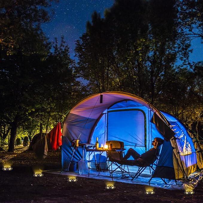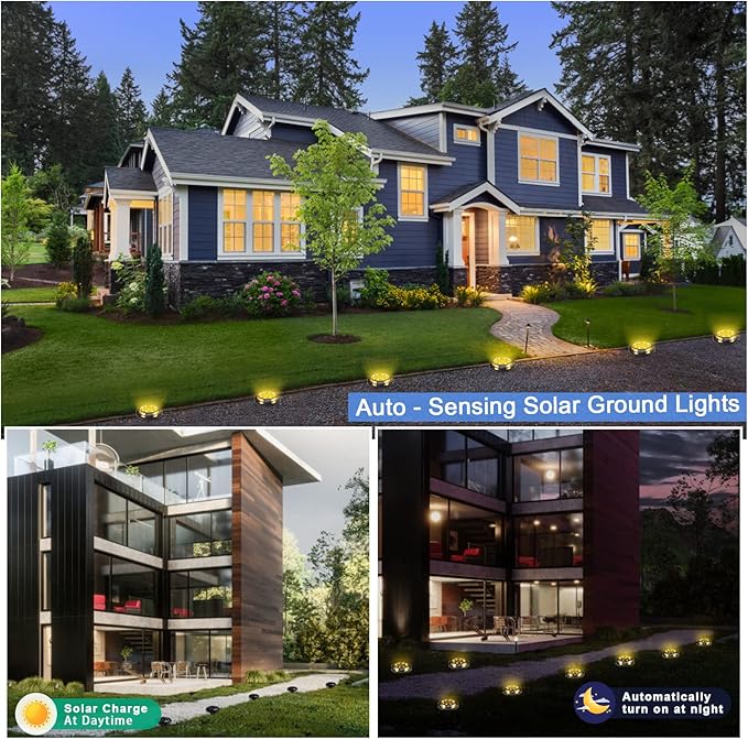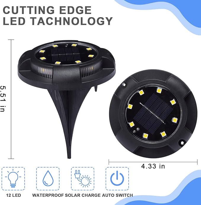 - 【Upgraded Design】12Pack 12 LED lamp beads solar ground lights, making the product have a larger lighting range than similar solar lamps.Warm-toned light is bright and warms the surroundings.