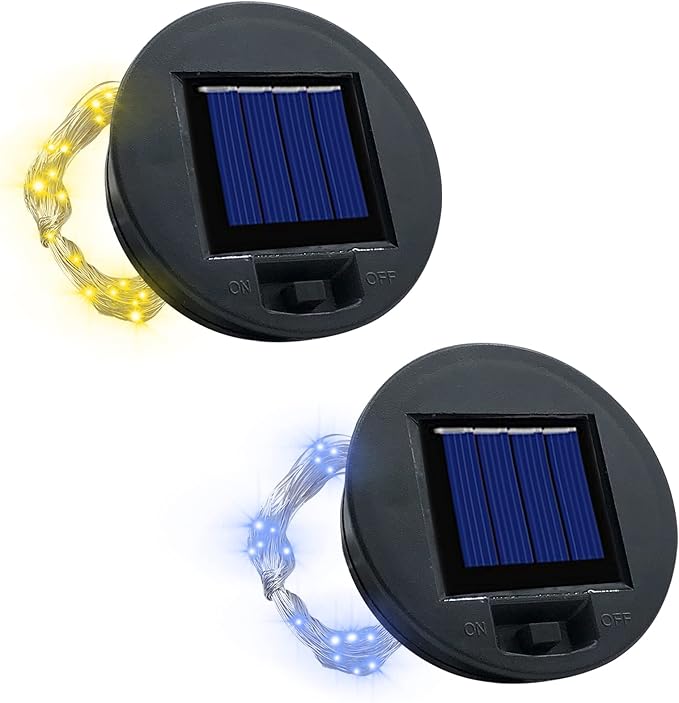 - 【Usage】You only need to take out the old battery box, put the new solar panel replacement top into the hole of the iron lamp, press the switch once,the string lights will turn on automatically at night and turn off at sunrise. A warm light and a cool white solar panel, you can change the decoration upon your mood.