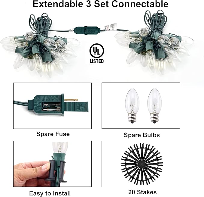 - Warm White Bulbs:This C9 Christmas Path Light Bulb is Detachable And Easy To Install Or Replace. Each Bulb Is 7 Watts, 120v. Suitable For E17 Base. This Walkway Lights With 20 Stakes Comes With A Spare Bulb X2 And A Spare Fuse In The Male Plug