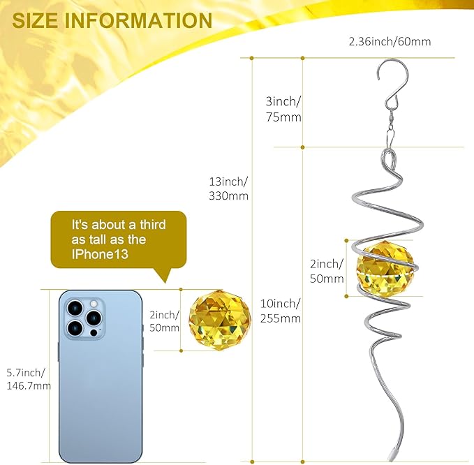 - 【 Cleverly Designed Spiral Tail 】When the Gazing Ball Spiral Tail spins, it has a magical hypnotic kind of effect. This crystal ball gives the illusion of moving up or down on a spiral tail. Gazing Ball Spiral is also a special crystal sun catcher rainbow maker. This spiral tail suncatcher captures rays of light, creating a cheerful light-scattering effect. Perfect for creating a relaxing atmosphere in your home, garden, patio or yard.