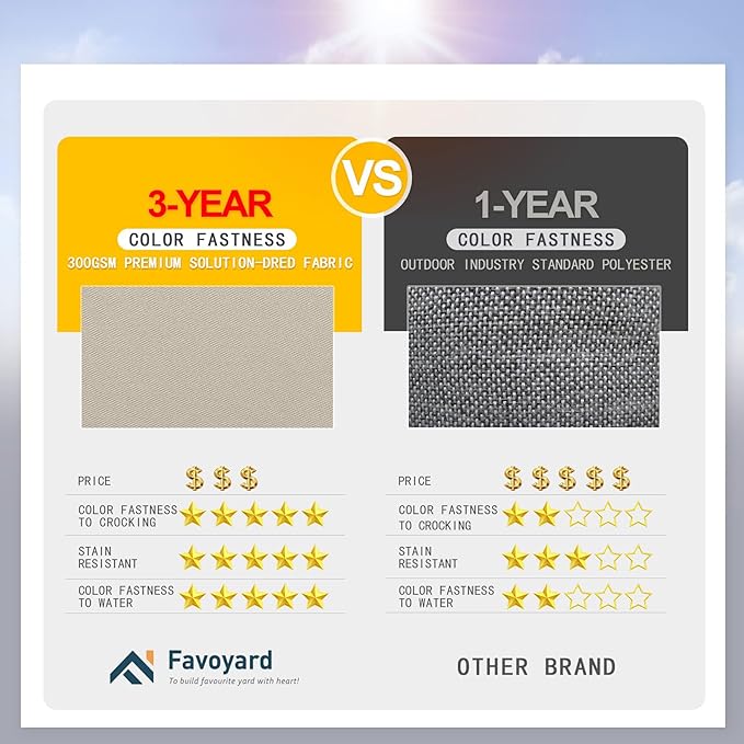 - 3-Year Color Fastness - Our patio chair cushions adopt 300GSM High Density polyester fabric, featuring a smooth yet slightly textured surface with a firm hand feel. Thanks to the superb coloring technology, we proudly say the fading resistant is 20 times that of ordinary products. Favoyard outdoor seat cushion for patio furniture is a perfect decor in garden, patio, beach and etc.