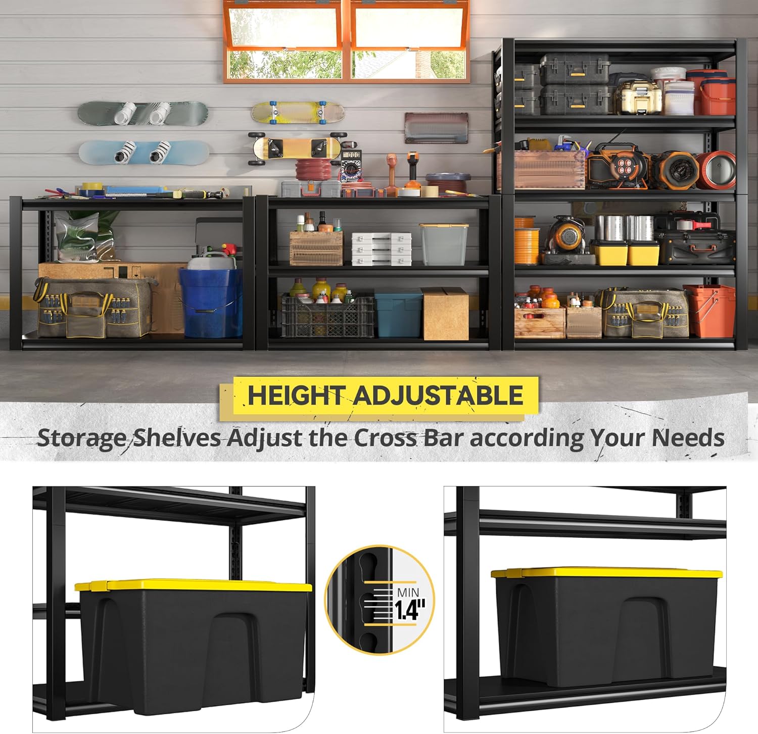 - 【Sturdy and Durable Garage Shelves】No wobbling or shaking when fully loaded as two-layer vertical support bars will help distribute the pressure. Each metal board has 3 support ribs that ensures no dent or deformation. The storage shelves lasts for decades for all storage needs and meets your expectations