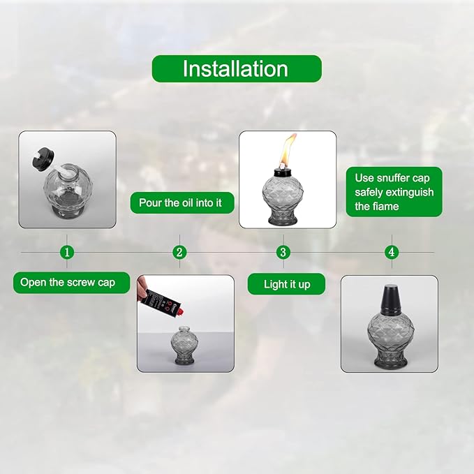 - EASY REFILL BOTTLE MOUTH: The outdoor table torch has a mouth with a diameter of 1.5 inches, which is easier to refill. All you need to do is add oil, install the cap and wick. Light up the glass torches for outside and you can feel the beautiful light effect.