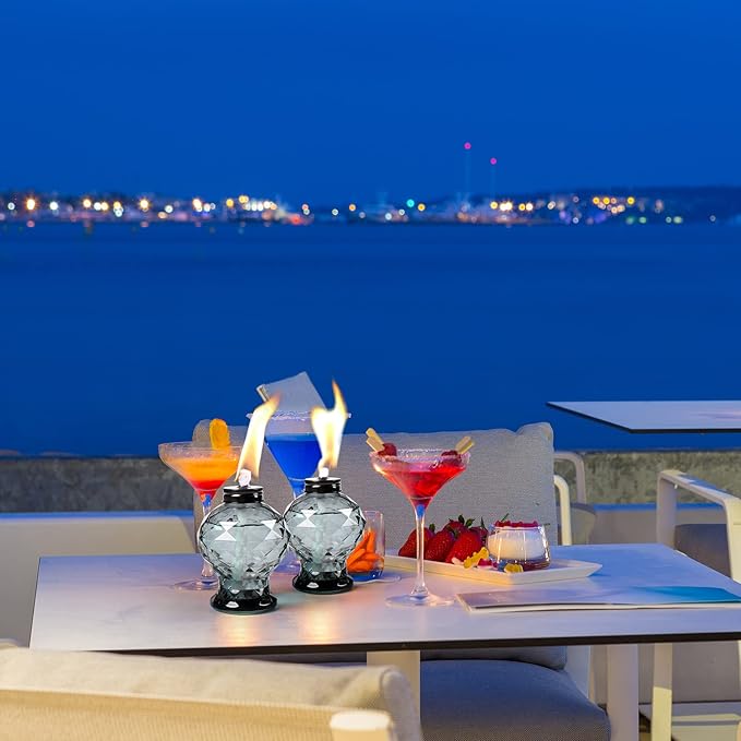 - EXQUISITE GLASS COUNTERTOP TORCH: The total height of the glass torch light with the cover is 6.3 inches, these glass bottle can be used as a delicate desktop decoration. The diamond-like cut surface reflects better lighting. Table torches outdoor perfect for creating beautiful lighting and party vibes when gathering with friends or having a BBQ.
