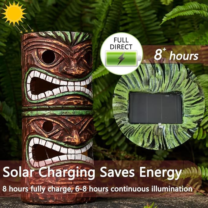 - Powered by solar panel:Simply turn the tiki statue switch on and leave it in the “on” position for easy use. The solar panel will charge 8 hours during the daylight and light up 6-8 hours automatically at night