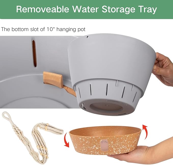 - SELF WATERING & VISIBLE WATER LEVEL: Self watering hanging pot is ingeniously designed, tightly connecting the tray and the pot body, turning the tray into a water reservoir with visible holes, allowing you to clearly see the water level (If you water too much, water will flow out from the edge of the tray to prevent the plants from being submerged)