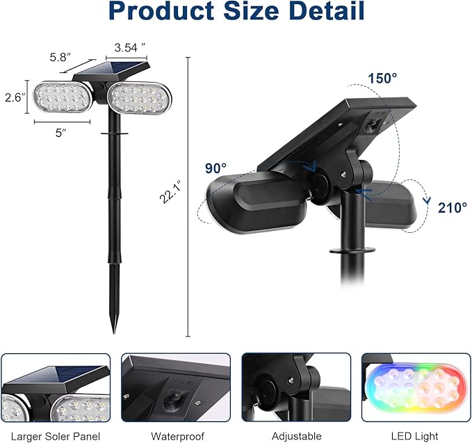 - đăDouble Heads 210° Adjustableă Double heads design of our solar colored landscape spot lights, the lighting area is larger, 210°adjustable no wires to run multicolored solar spotlight, Zero electricity bill.