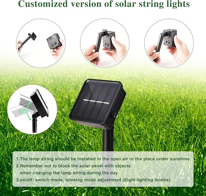 - Solar Light String:This product is an upgraded product, equipped with a customized version of the solar string lights. After the installation is completed.With 8 modes of light switching mode,this night can also feel the unique glowing splendor of the product.