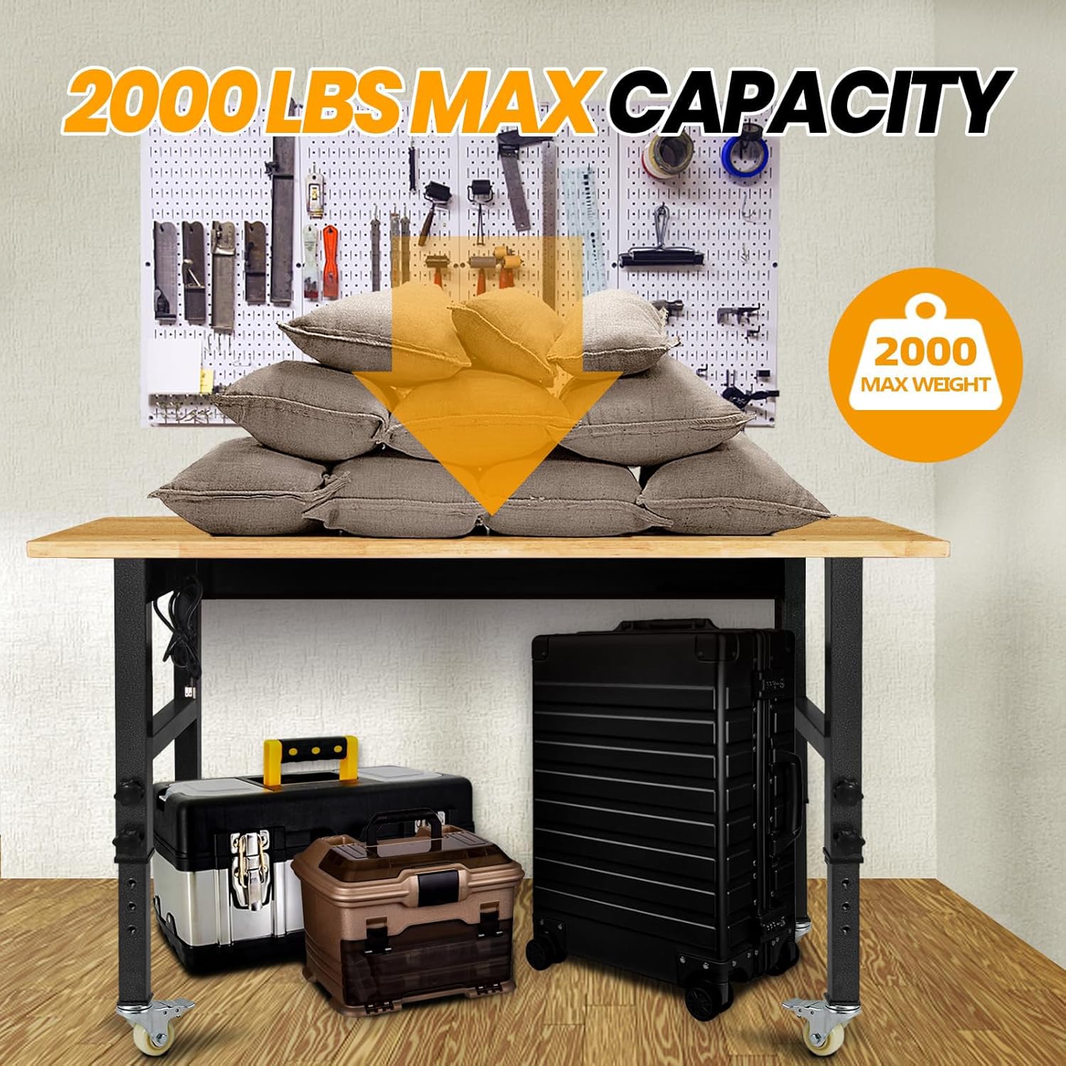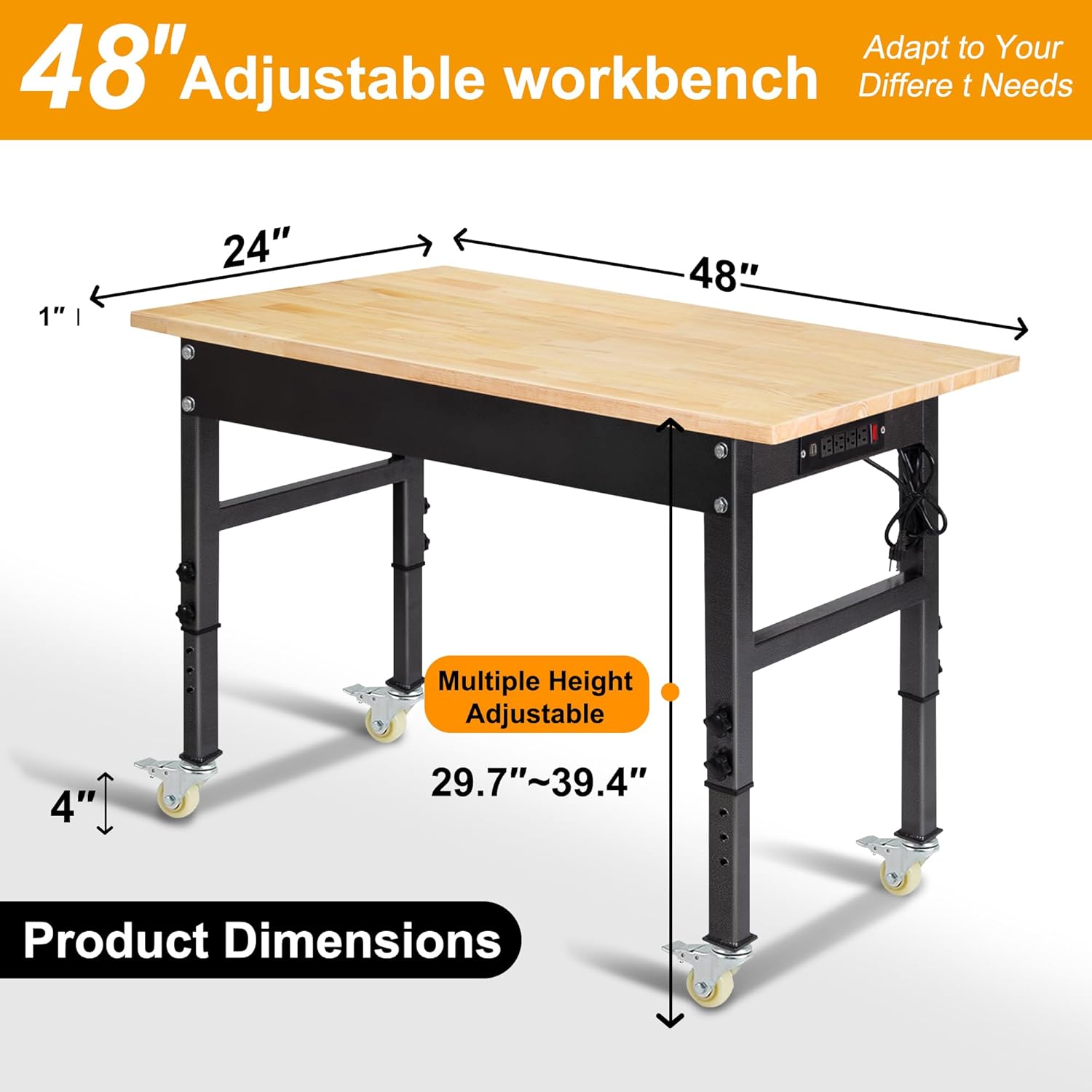 48" Adjustable Work Bench, Rubber Wood Top Workbench Heavy-Duty Work Table with Power Outlet,workbenches Wheels, 2000 LBS Load Capacity Hardwood Work Benches for Garage, Workshop, Home, Office