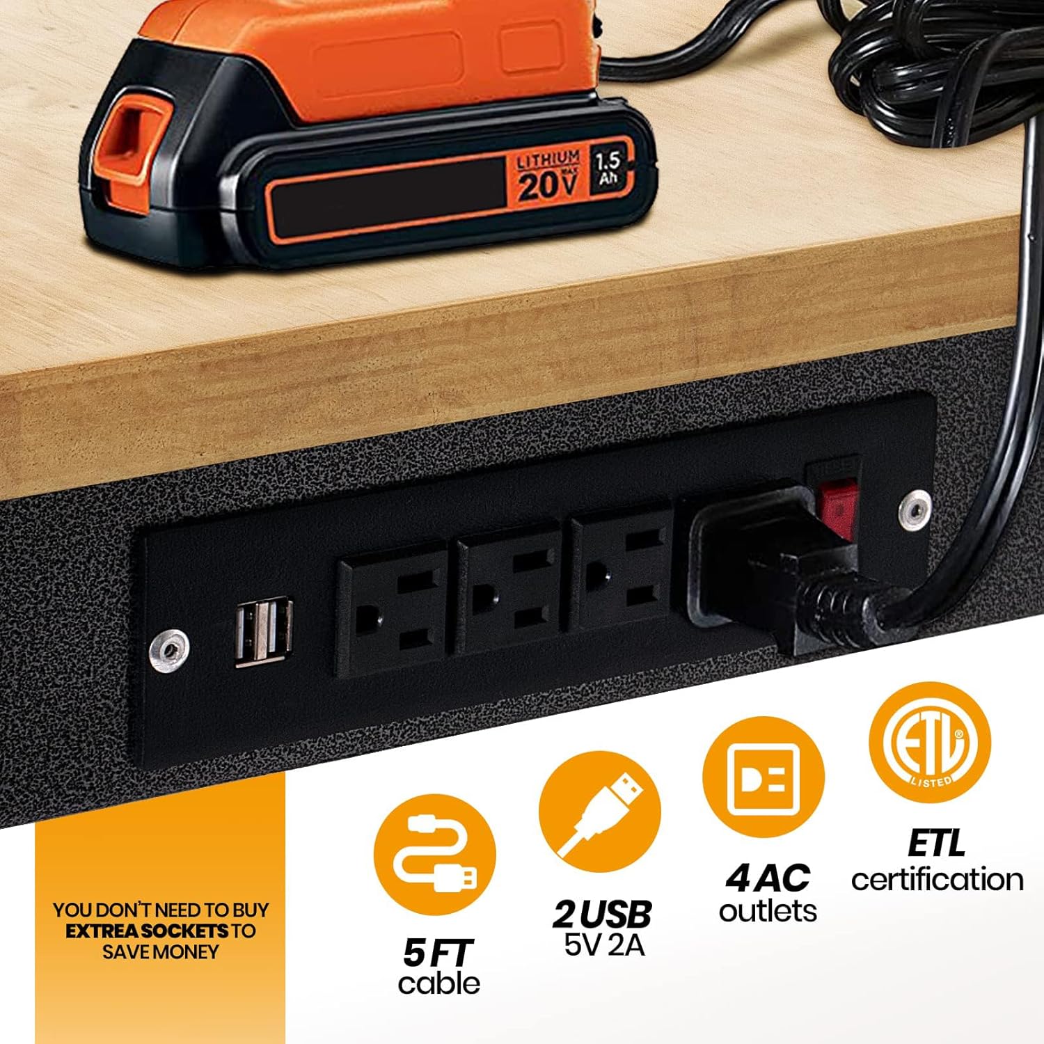 - 【Power Strip】:We fitted a power outlet for the workbench.Convenient for you to use a variety of power tools and lamps. sewing table has 4 AC Outlets and 2 USB-A ports on the power strip.