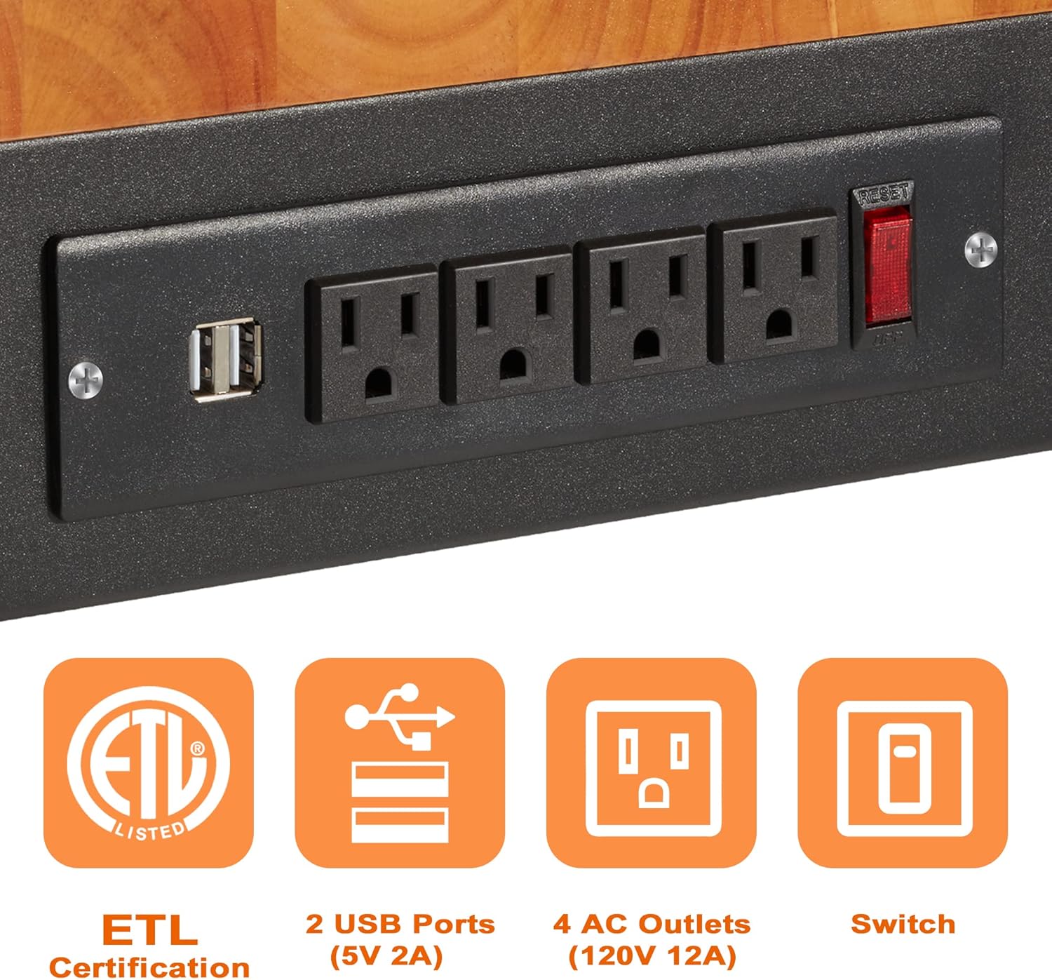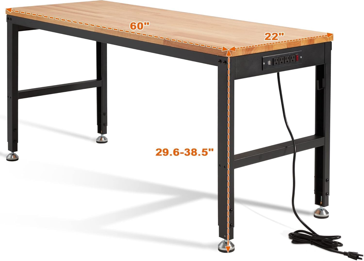 Haddockway Adjustable Workbench for Garage, 60" x 22" Rubber Wood Top Worktable with Power Outlets, Max 2000 Lbs Load Capacity Heavy Duty Workstation for Workshop Office Home (Black Frame, 60in)