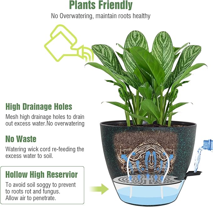 - [Self Watering Pots with Extra 40oZ Capacity Deep Reservoir] 10 inch plant pots with deep reservoir that store extra water when travel or business trip. 40oZ capacity water can be auto-watering for plants over 7~14 days.