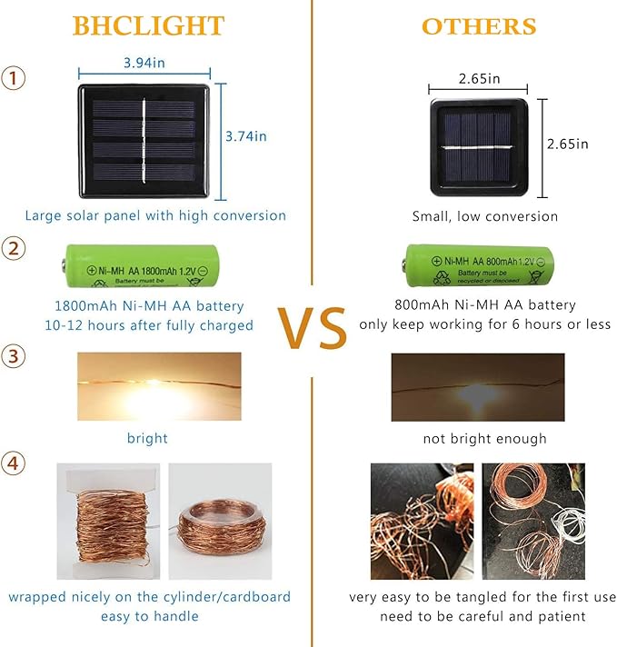 - [Upgraded 2 Pack Super Bright Solar Christmas Lights]: Cute shaped, powerful 1800mAh Capacity Battery, Super Bright Total 200 LED 80FT, Upgraded Larger LED Beads, IP65 Waterproof Performance. Durable Flexible Copper Wire, Quick Charging Technology, Romantic Christmas Decorations. Solar string lights outdoor waterproof will be a great choice.