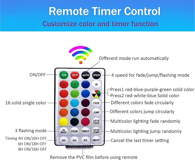 - 7 Lighting Remote Control & Timer: Use the 32 keys remote controller for easily operation.7 lighting modes make the PVC tube fairy string lights fabulous:FADE, JUMP, ASYN FADE, ASYN JUMP, TWINKLE, STROBE, IN WAVES.This decorative solar rope string lights make your house and garden charming and romantic. Timer function : 4H/6H/8H. Freely control the solar Christmas lights, COLOR, MODE and TIMER are all in your control.