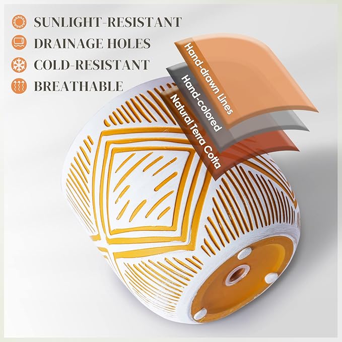 - Boho Style Flower Pots: The 2 modern bohe style ceramic flower pots have raised carved lines and bright yellow lines inside for a vibrant look.