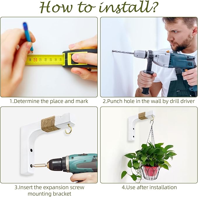 - 【Easy to Install】Our plant hanger bracket hooks have two screw holes of each and includes mounting hardware for each hanger (4 mounting screws and 4 drywall anchors). You can follow these steps to complete installtion within miniutes : find the place where you want to install, mark the hole, drill the screw hole as you makred, insert the drywall anchors then install the hanger hooks and complete.