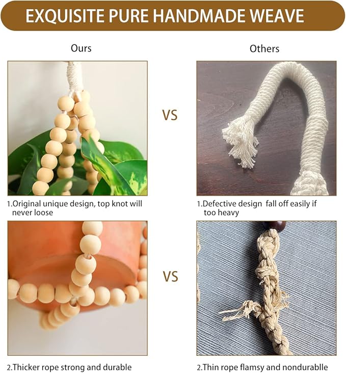 - HANDMADE WEAVING CRAFT - The boho hanging plant holder is made of 100% natural cotton and wood beaded with no tassels. It has a strong flexible woven design, sturdy, durable, washable and eco-friendly