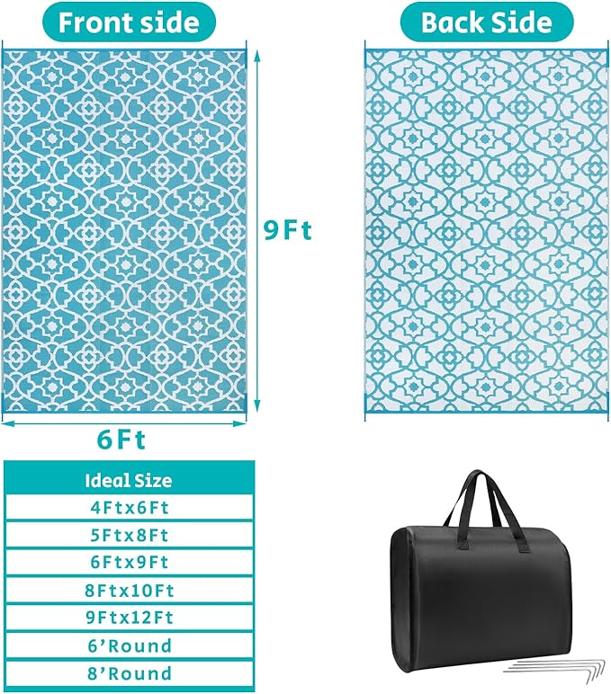 • XL Large Reversible Outdoor Rugs: Featuring a classic moroccan pattern on both sides, this rectangular 6x9 ft outdoor area rug allows you to instantly refresh your patio, porch, backyard, deck, RV campsite. And this outdoor deck rug is reversible, two-sided design allows you to have two different looks,both sides can blend perfectly with nature and look very full and comfortable.