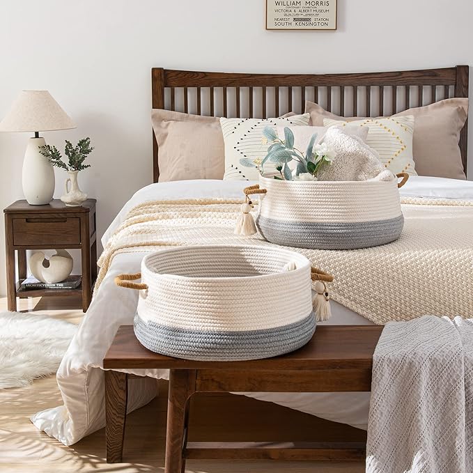 - ⭐【100% NATURAL HANDMADE】:100% cotton rope,soft material without any chemicals woven basket. There are No plastics. No harsh chemicals. Our basket is soft and safe for kids and pets.our rope baskets are super durable and hold their shape well. they can be hand washed / air dried or put in your washer / dryer on delicate.