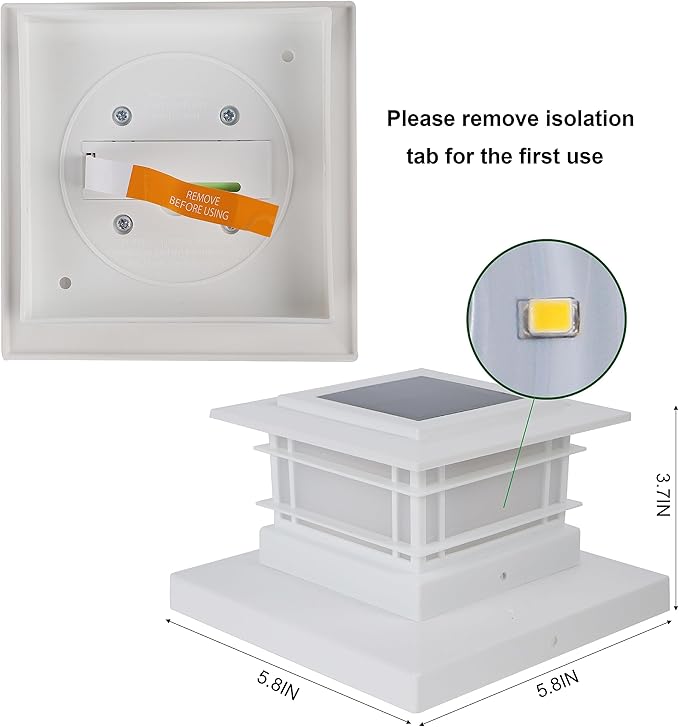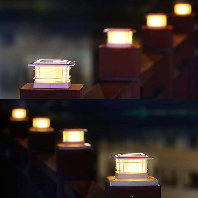 - WHITE PLASTIC SHELL SOLAR POST LIGHTS: 6 pack modern post cap lights powered by solar, each with 8 warm white SMD LED, they are the perfect decorative outdoor lighting and no electricity required. Add a 360 degree viewing angle illuminate charming to your garden, decorate your fence, deck, porch or yard. Measurement: 5.8 x 5.8 x 3.54 inches. Please note that the lighting is as shown in the figure, and there is No Flickering Flame Effect
