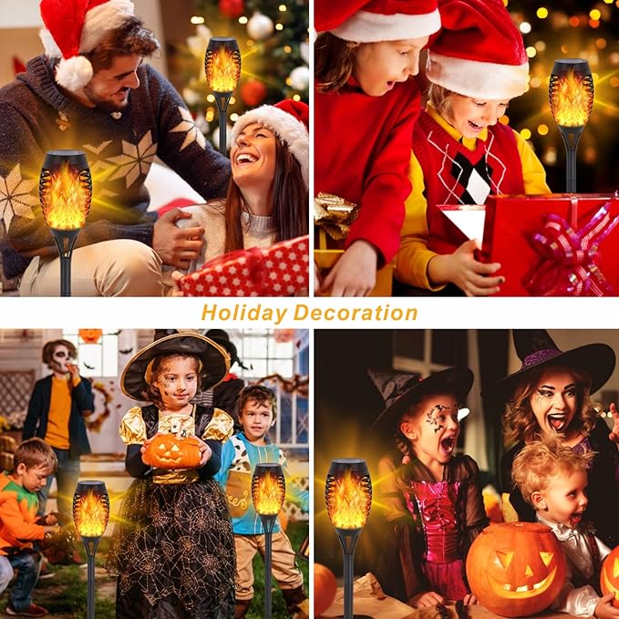 • Upgrade Solar Torches Lights with Flickering Flame: Mini-Size 12LED solar lights outdoor cast a gorgeous, soft, vivid and safe glow, which provide a charming campfire atmosphere for your family. Solar torches are suitable outdoor decorations for patio, garden, yard, porch, making your garden stand out in the community