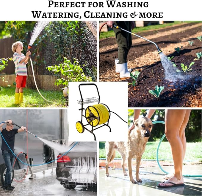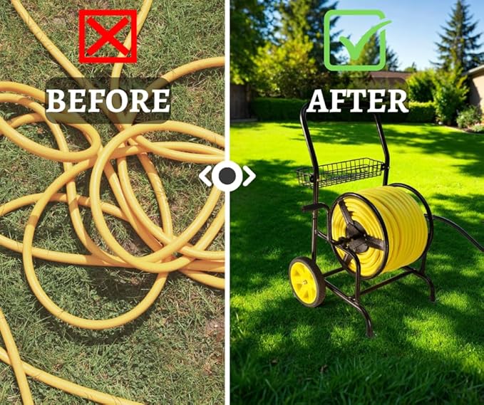 - Sturdy Construction: Metal hose cart is built with high-quality materials to withstand the elements and provide long-lasting durability. Includes garden hose reel cart accessory basket for convenient storage for garden tools and 6ft leader hose included.