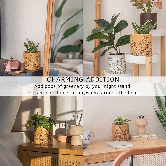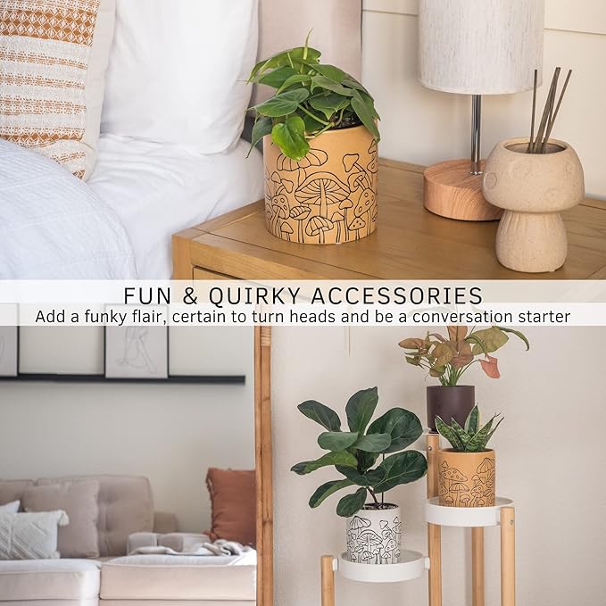 - Mushroom Planter with whimsical etched design all around. Fun and eclectic decoration sure to make a cottagecore statement. Holds small indoor plants, fresh flowers, and succulents