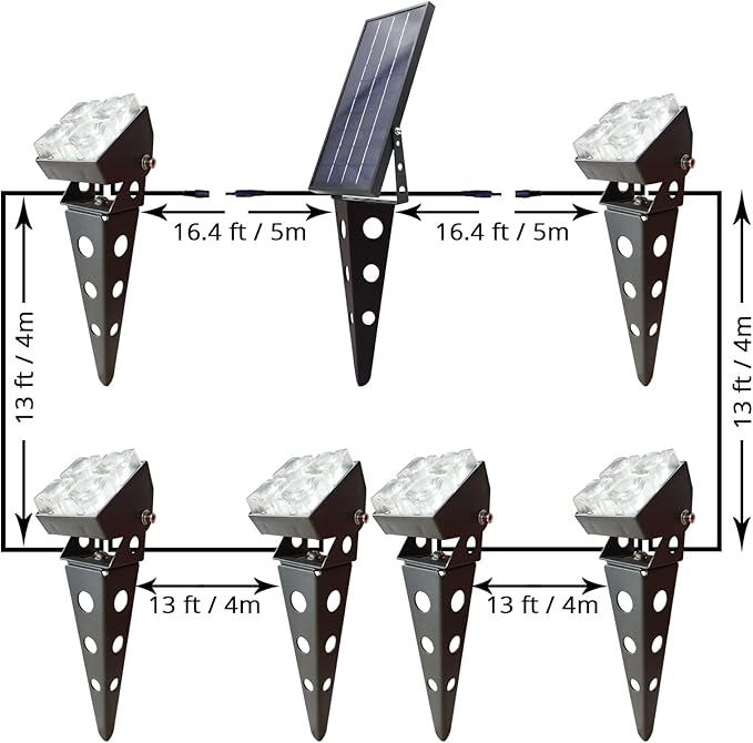 - 【High Efficiency Warm White LED】The Solar Garden Spotlight use high efficiency Warm White LED which specially design for Solar Light, consume less energy but output more brightness than common LED. Special 30 degrees lens make the light much more focus. 13ft cable length between lights can meet various installation needs.