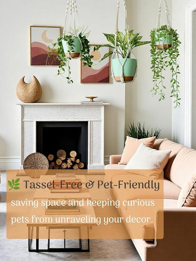 - TASSEL FREE -- This Macrame plant hangers with pot included set lacks the tassels common on many other macramé plant holders, saving space while avoid pets destroying your plants.