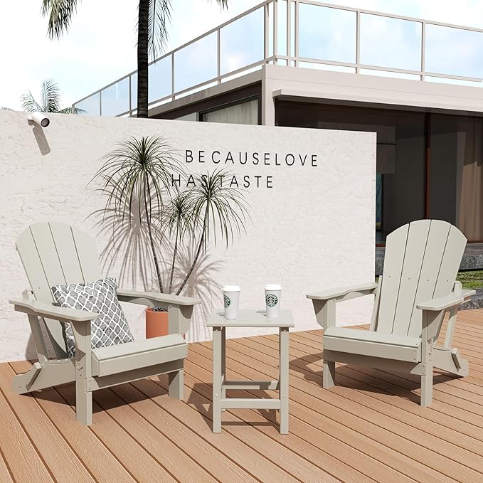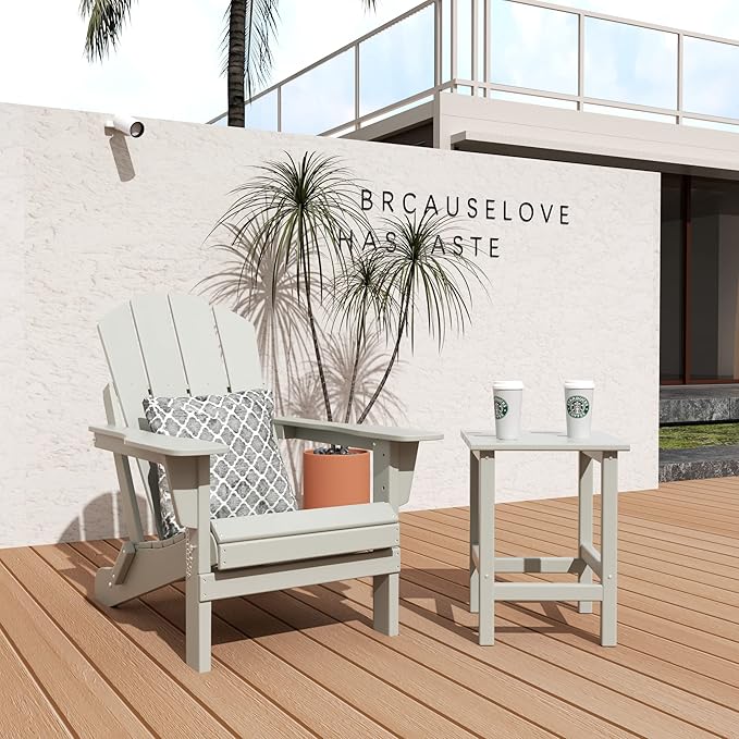 WO Home Furniture Adirondack Chair Table Set of 2 PCS Outdoor Folding Chair w Side Table Weather/UV Resistant for Lawn, Garden, Bon Fire, Balcony (Sand)