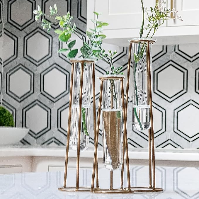 - Modern Design / boho decor- The Test Tube Plant Stand Indoor features a cluster of varying heights that include three test tube vases welded together at the base. Each glass test tube and metal holder is safely bubble wrapped and shipped in a white box.