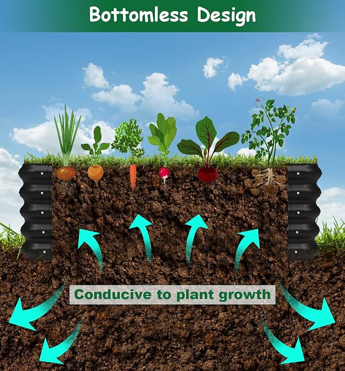 - Optimal Design for Plant Growth: These outdoor planters are produced with an open base design that allows the root system of plants to fully grow into the ground, promoting healthy growth. The design also facilitates drainage. We recommend that when placing the planter boxes, you can bury the bottom end into the ground at a depth of about 1 inch, which can effectively make it stable while using.