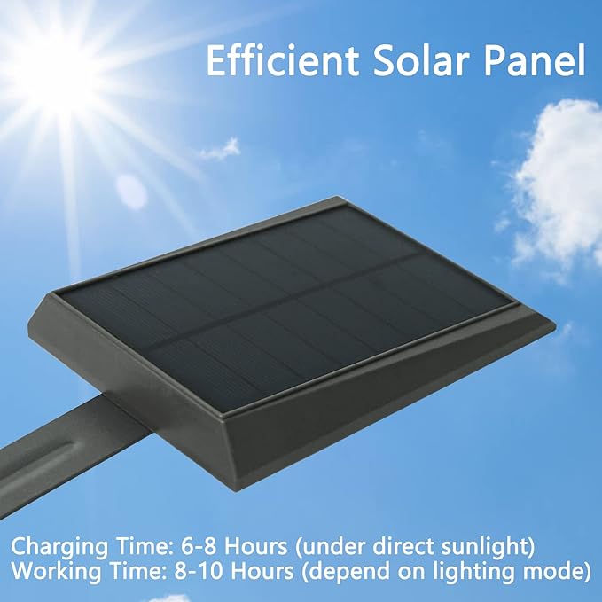 - Efficient Solar Panel - Large solar panel on top with high conversion rate more efficiency when charging, can be full charged in 6-8 hours under sunlight, and keep lighting for 8-10 hours in different mode, Please install on wherever can receive direct sunlight, avoid shade to ensure fully charge at day