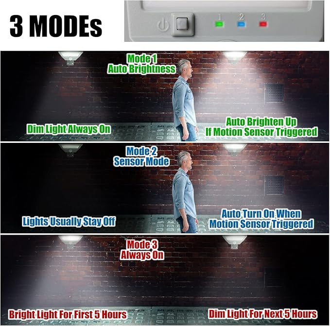 - 3 Lighting Modes - Mode 1: dim light always on and auto brighten up if motion sensor triggered, Mode 2: usually stay off and auto turn on light up when motion sensor triggered, Mode 3: always on, bright light for first 5 hour and dim light for next 5 hour