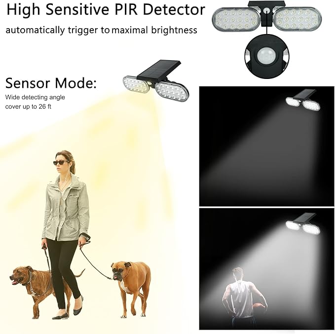 - 2 Lighting Modes – Solar motion lights have 2 modes, Sensor Mode: all LED lights stay on minimum brightness and automatically turn to maximal brightness when the motion sensor triggered, Safety Mode: all LED lights keep lighting on medium level of brightness