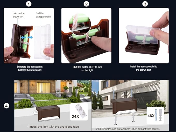 - 【Automatically ON/OFF】These outdoor step lights are fully powered by solar energy, built-in light sensor, automatic "ON OFF" switch from dusk to dawn.Please note: 1. The switch inside should be turned ON before the first charging. 2. If the light doesn't light up, please try shifting the switch from ON to OFF and then back to ON again. Or check if the battery is in correct position.