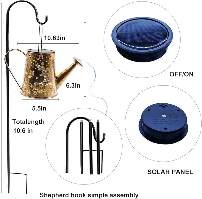 - Easy Installation: Solar watering can use high-quality metal material, waterproof and rust-proof, works in all kinds of weather. Not easy to break and No need to assemble when using, this watering can with light can be hung directly by the included shepherd hook