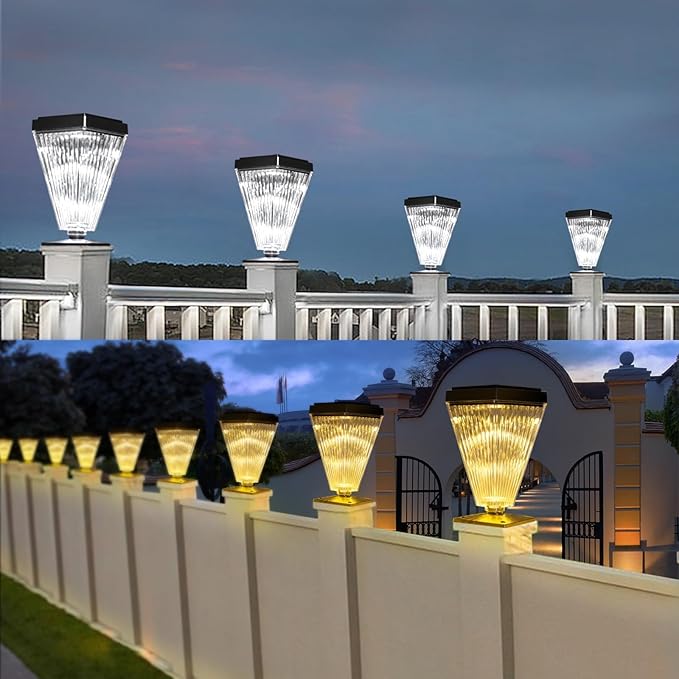 - 🌞QINGYA Solar Post Lights-6 pack solar post cap lights provides warm white/Natural white/ cool white 3 mode lighting effect,brighter than other solar lights. The transparent plastic ampshade ensures light transmittance for brighter lighting, making a unique and beautiful lighting landscape outside the house. Adapting warm white LED, these outdoor solar lights will decorate your home or garden beautifully, enough to light up your yard and not feel the glare.