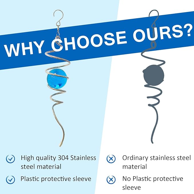 - ✔【Easy to use】The spiral tail wind spinner can't spin by itself ,if you want to make it spin like the video ,need add 1pc motor (not include) ,or combine it with a wind spinner or any rotatable hanging ornament to help it rotate. Come with 1pc 2 inch blue glass orb(not paint),1pc silver color spiral tail twister,and 1pc swivel hook accessory, ready to hang and enjoy.