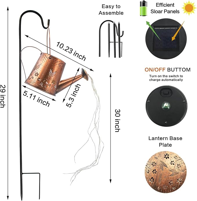 - 【Solar Watering Can With Lights】This solar outdoor lights is a unique and attractive outdoor decoration for gardens,vividly imitating the effect of flowing water.There are 6 copper string lights with a length of 25.9 inches (75 centimeters) and 42 ultra bright LEDs.The 32 inch shepherd hook attached to the solar waterfall lights is a perfect addition to garden decoration for your vines,potted plants,porch,path, terrace,and more.