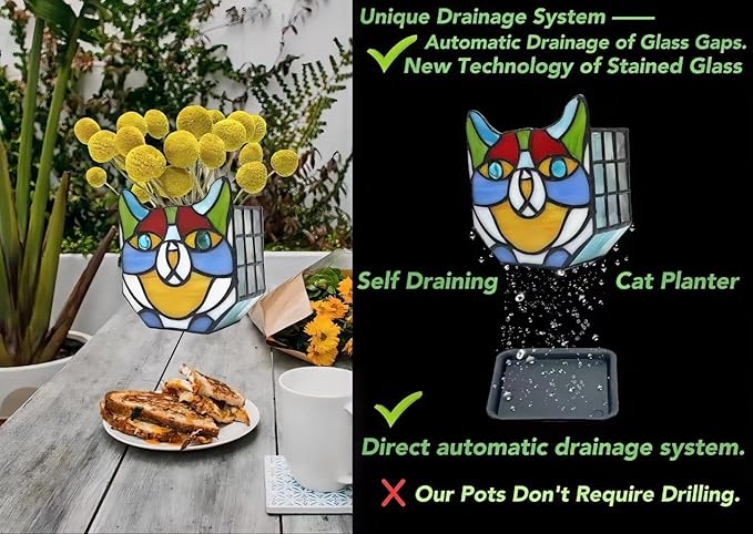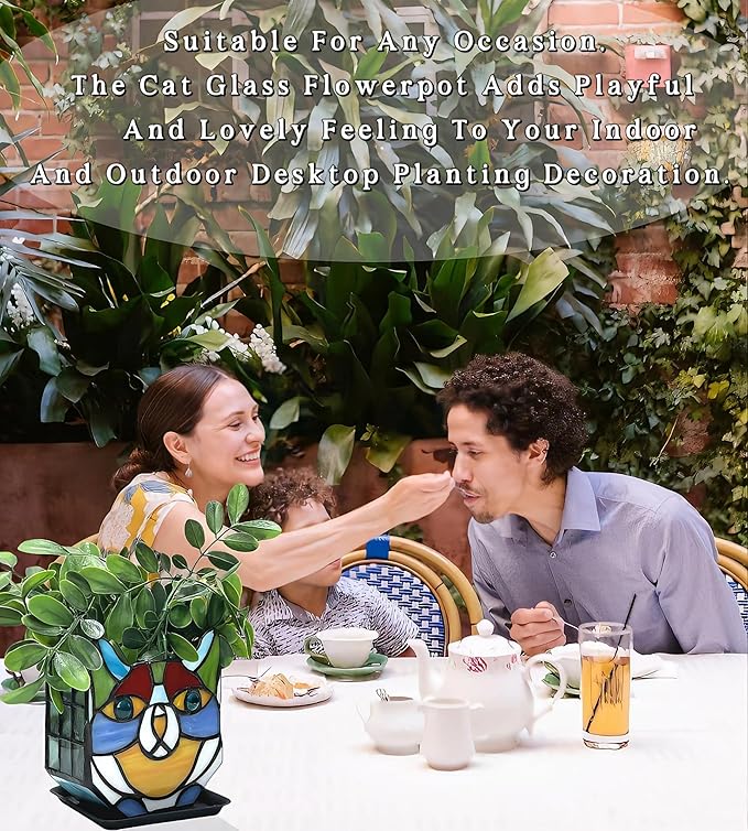 - HOME DECOR:This planter is also perfect for those who enjoy gardening but have limited outdoor space;Bring the beauty of nature indoors with the Stained Glass Cat Planter and add a touch of whimsy to your home decor