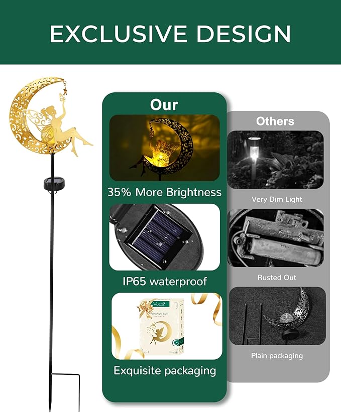 - WEATHER-RESISTANT: Our Vuees solar garden decor lights are constructed with premium stainless steel and thick brass, ensuring durability. They are coated with rustproof paint and feature a waterproof IP65 design, allowing them to withstand various weather conditions and maintain long-lasting functionality.